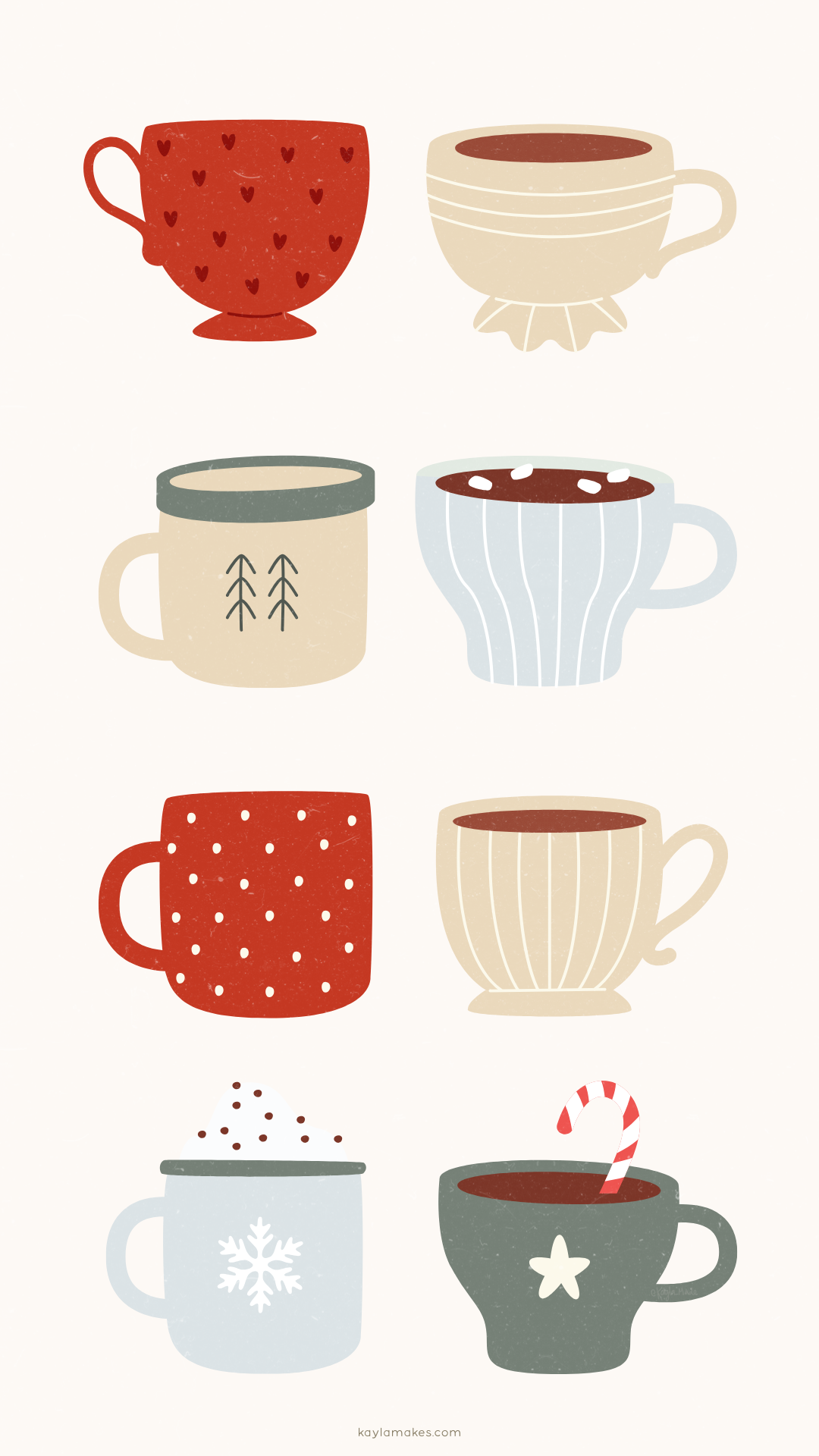 For my fellow hot cocoa and coffee lovers, this wallpaper is for you. A lineup of festive mugs filled with warm holiday cheer — because one cup is never enough this time of year.